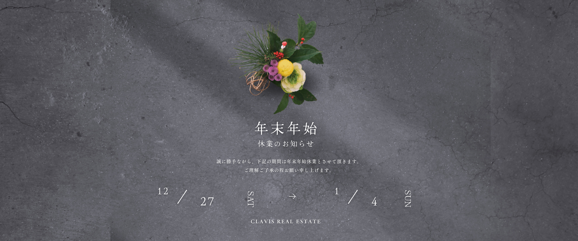 平素より クラヴィス・リアル・エステート のホームページをご覧いただき、誠にありがとうございます。 誠に勝手ながら、下記の期間を年末年始休業とさせていただきます。 ■ 年末年始休業期間2025年12月27日(土)~202 […]