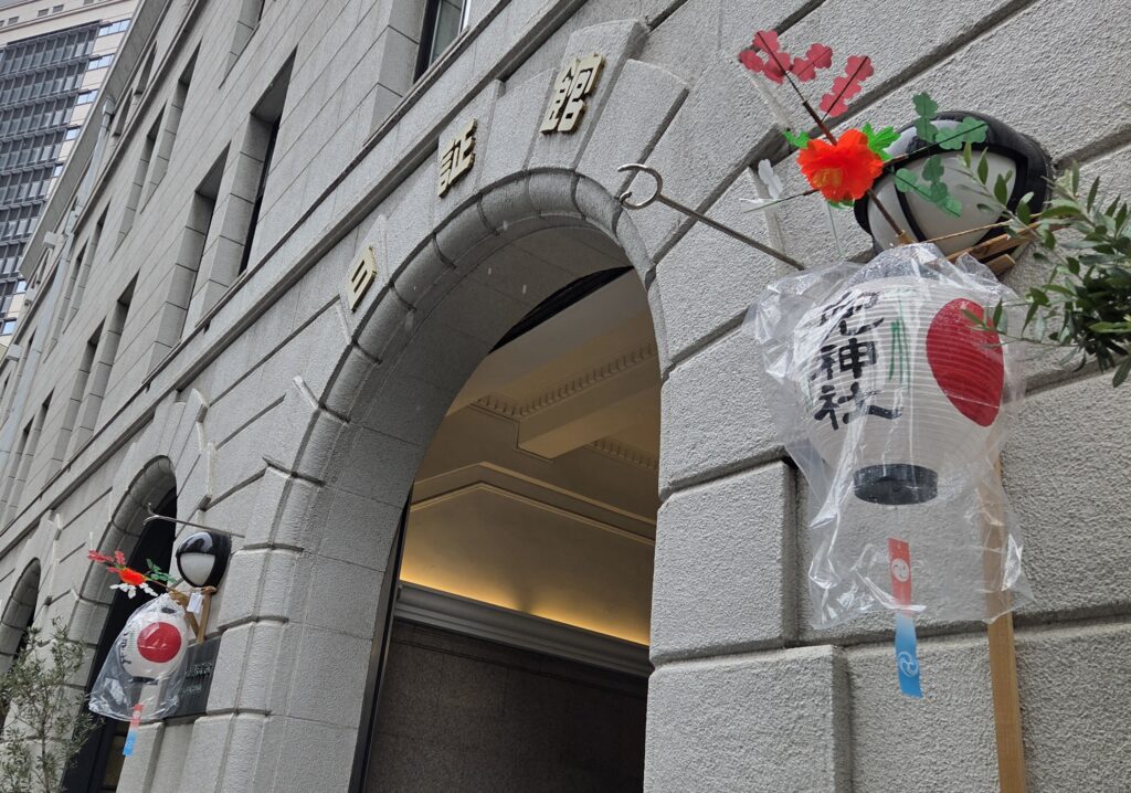 この時期、歴史的建造物である日証館にも立派な提灯が飾られ、兜町の街全体が華やかな活気に包まれます。